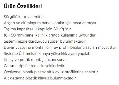 Taşıma kapasitesi 1 kapı için 60 Kg 'dır.
