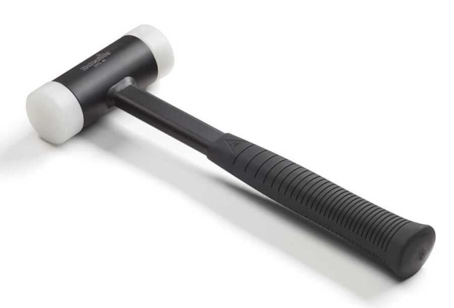 Sönümleyici çelik bilyelerle doldurulmuş çelik çarpma başlı çekiç. Kafa, iş parçalarına zarar vermeyen değiştirilebilir naylon karşılıklara (sertlik 70 Shore) sahiptir. Kauçuk saplı çelik mil.