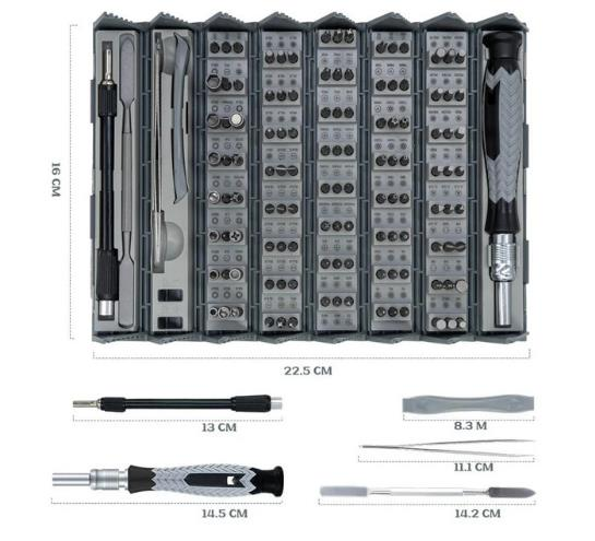 Çok çeşitli tornavida modelleriyle bu set, telefonlar, tabletler, dizüstü bilgisayarlar, kameralar, oyun denetleyicileri ve daha fazlası gibi çeşitli elektronik cihazları içeren sökme, onarım ve kendin yap projeleri için mükemmeldir.