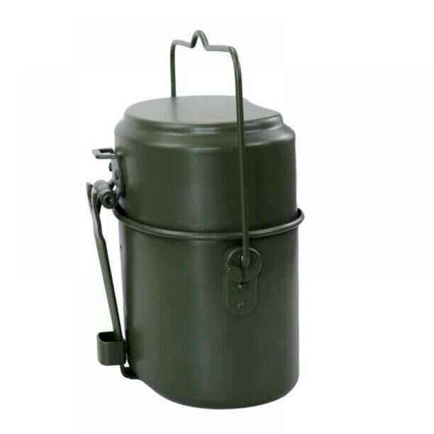 Üç parçalı yemek kabının iki küçük kasesi ve bir büyük kasesi vardır. Küçük kaselerden birinin yemek pişirmek için kulpu vardır. %100 alüminyum yapı, otantik Alman Birinci Dünya Savaşı / İkinci Dünya Savaşı askeri tarzı