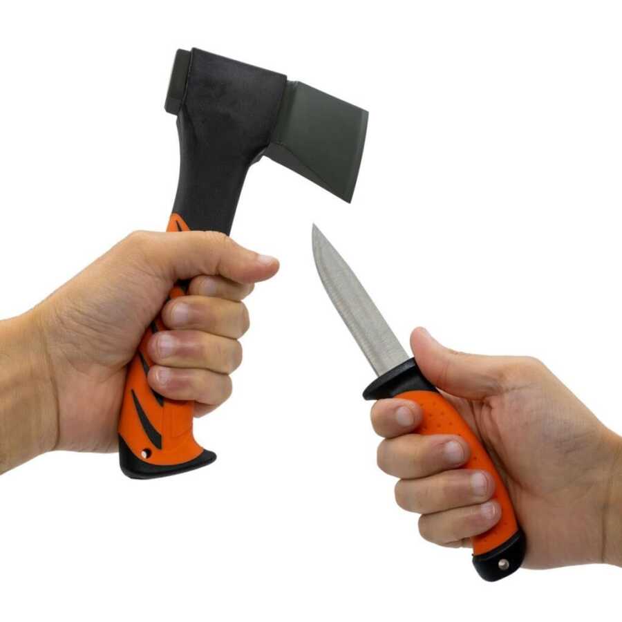 Dört parçadan doluşan çantalı balta, bıçak ve bileme setinden oluşan pratik doğa setidir.