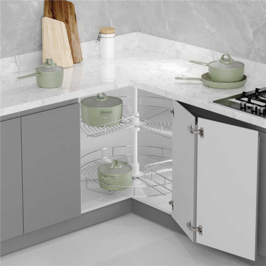 Köşe dolaplarında, menteşeli iki kapak ile kullanıma uygundur.
