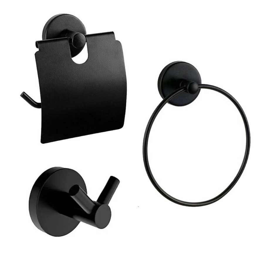 This three piece bathroom set is made from durable metal material and is resistant to moisture. Its solid construction ensures long lasting use. The easy to clean surface provides hygienic maintenance. It is an ideal choice for home bathrooms and hotel projects.